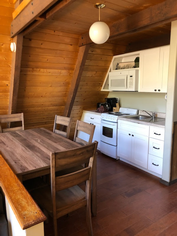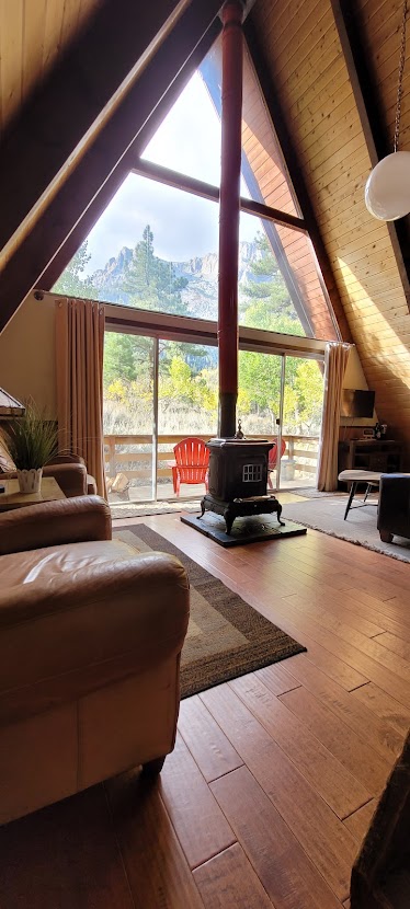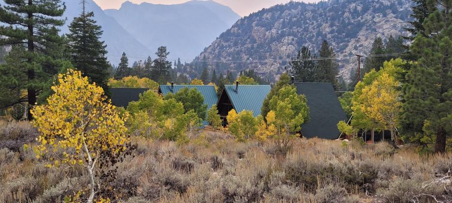Each of our five cabins have a private bedroom with a queen bed, a loft with 3 twin beds, a single bathroom, kitchen, dining and living area. They all sit on the edge of the Inyo National Forest with back patio access to Yost and Fern Lake trails and spectacular unobstructed views of Carson Peak